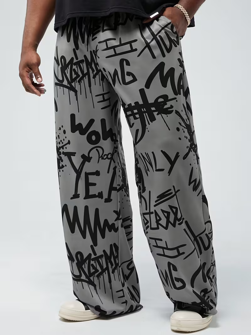 Casual Pants in Dark Gray with Drawstring And Graffiti Design