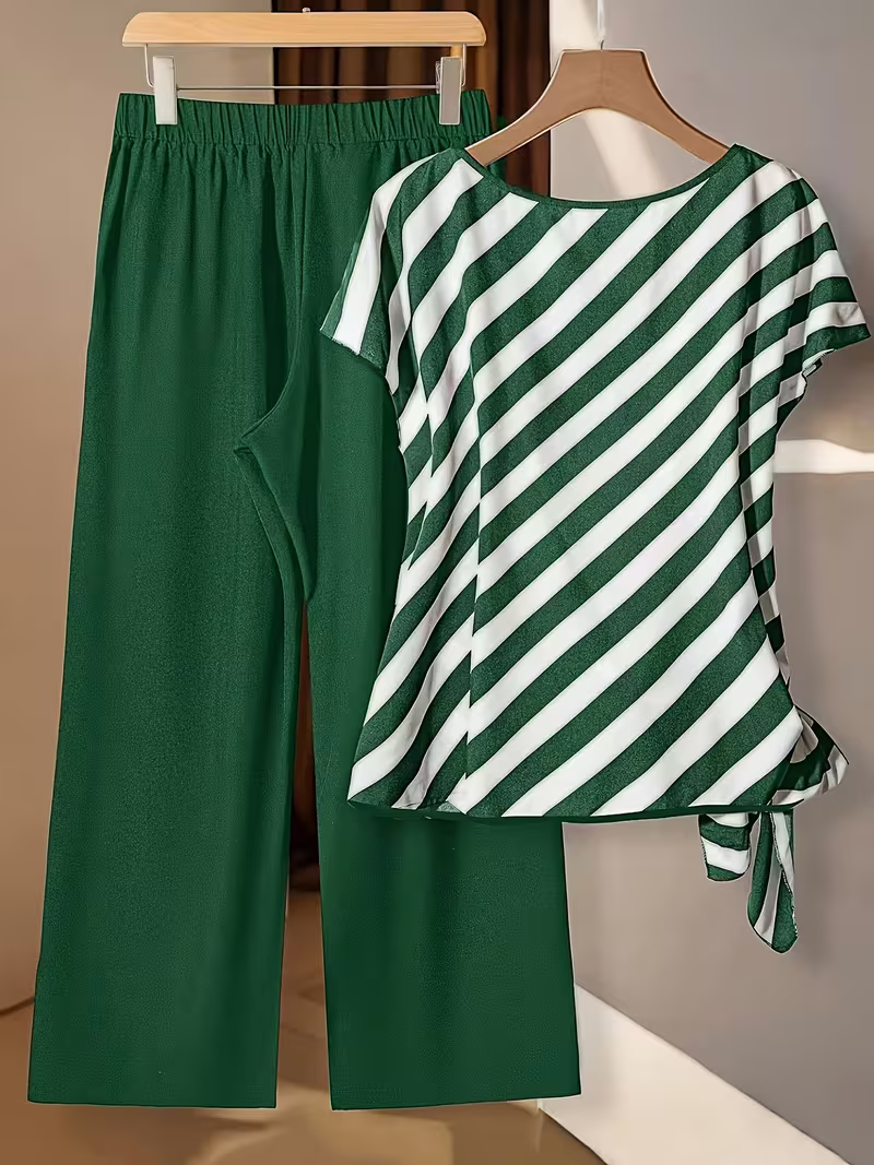 Round-Neck Striped Top And Solid-Color Pants Set